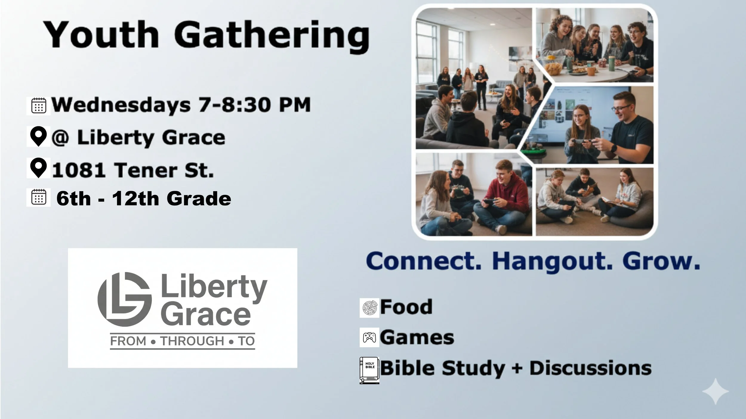 FCA and Liberty Grace have partnered to provide a community youth group hosted at Liberty Grace. This is a ministry for students in grades 6-12 which seeks to help students build a relationship with Jesus through Biblical instruction and discipleship. Students are encouraged to build significant relationships with fellow students and adult volunteers to help them mature both spiritually and as a person. Throughout the year, we will offer many exciting opportunities including community outreach, mission’s trips, district youth events, summer camps, and conferences.